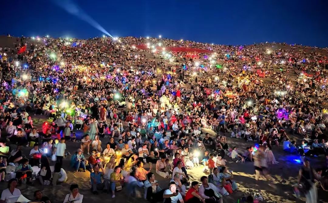 夜幕降临,敦煌市鸣沙山月牙泉开启万人星空演唱会。周斌全摄