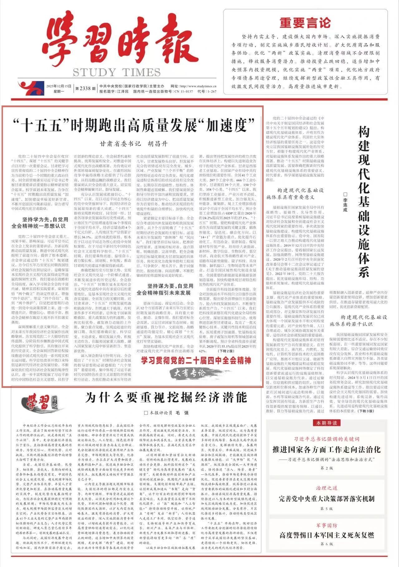 党的二十届四中全会是在收官“十四五”、谋划“十五五”的关键节点召开的一次重要会议。甘肃把学习宣传贯彻党的二十届四中全会精神作为当前和今后一个时期的重大政治任务,同全面贯彻落实习近平总书记考察甘肃重要讲话重要指示精神紧密结合起来,科学谋划未来发展,力争在“十五五”时期跑出高质量发展“加速度”,加快建设幸福美好新甘肃、不断开创富民兴陇新局面,奋力谱写中国式现代化甘肃篇章。