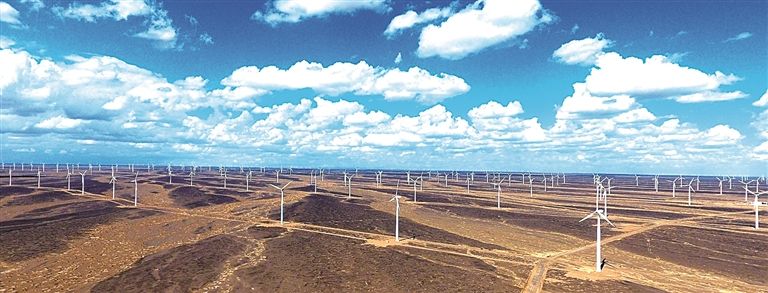 甘肃茫茫戈壁上风机林立。资料图片