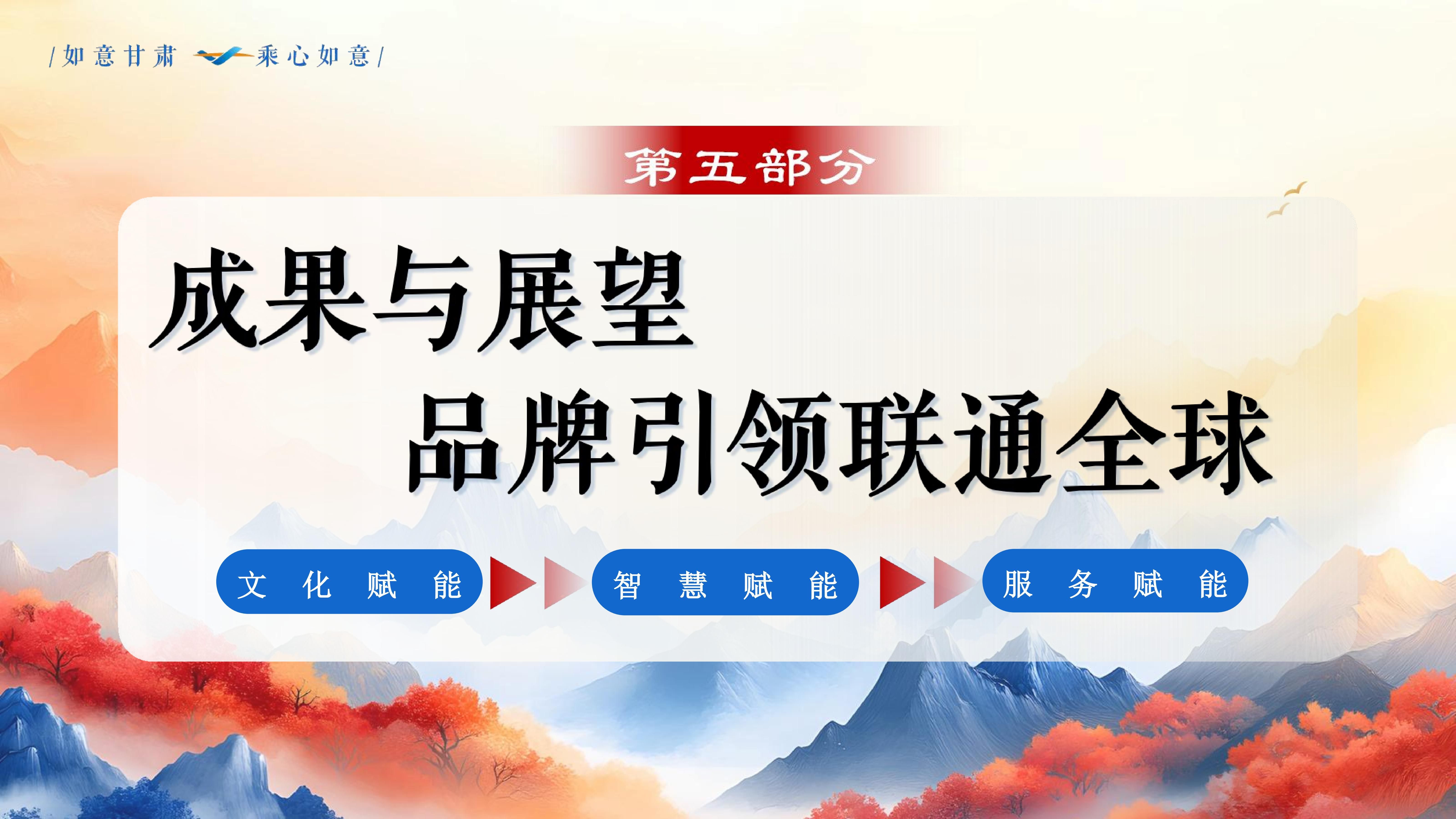 “如意甘肃·乘心如意”品牌作为第七届“空中丝绸之路”国际合作峰会中国服务示范案例,是其建设成果的高度认可。品牌通过文化赋能、智慧赋能与服务赋能,推动高品质出行与高质量发展同频共振,成为“交通强国”建设的生动实践,为甘肃联通世界搭建起崭新的空中桥梁。