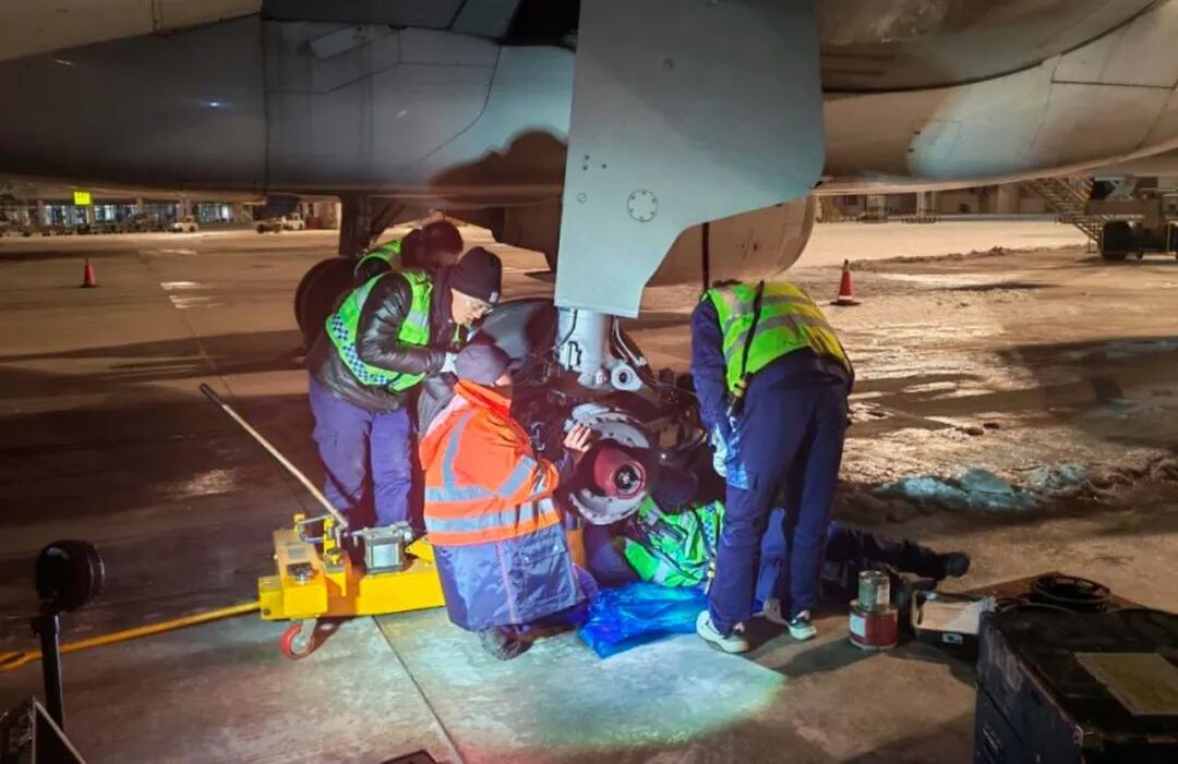 深夜,兰州机场机坪温度低至零下14℃,机务维修人员正在更换飞机主轮刹车。