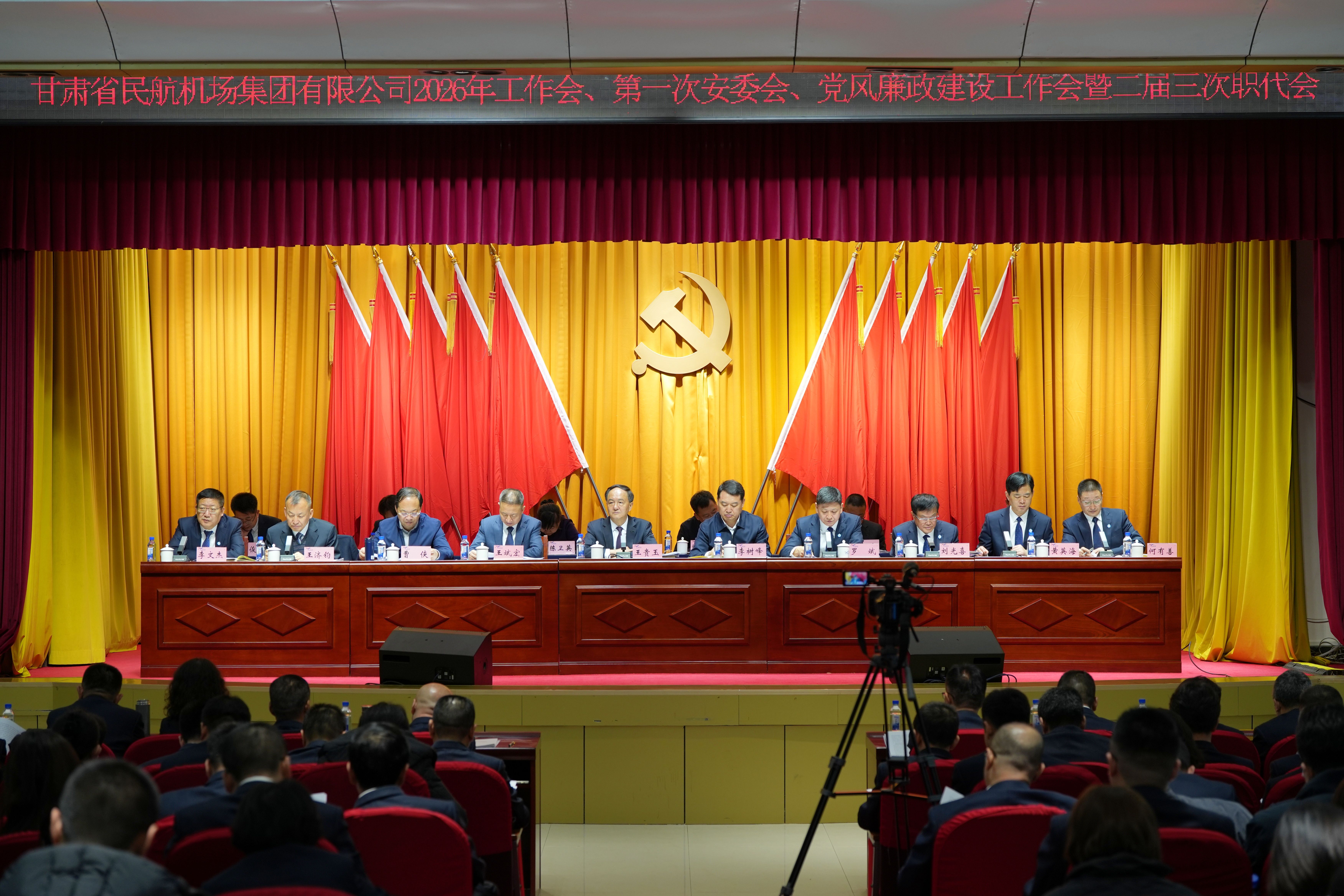 省交通运输厅党组成员、副厅长李树峰,民航甘肃监管局党委书记、局长王斌宏,省政府国资委二级巡视员曹侠等行业相关单位领导到会指导。集团党委书记、董事长王贵玉出席会议并讲话;集团党委副书记、总经理罗斌作了题为《聚力攻坚提质效 乘势而上启新篇 为甘肃民航“十五五”高质量发展筑牢坚实根基》的工作报告。集团党委副书记、工会主席刘光喜主持会议。集团领导班子成员、高管,机关全体干部职工,各单位主要负责人及职工代表、先进集体和个人代表共计250余人参加会议。