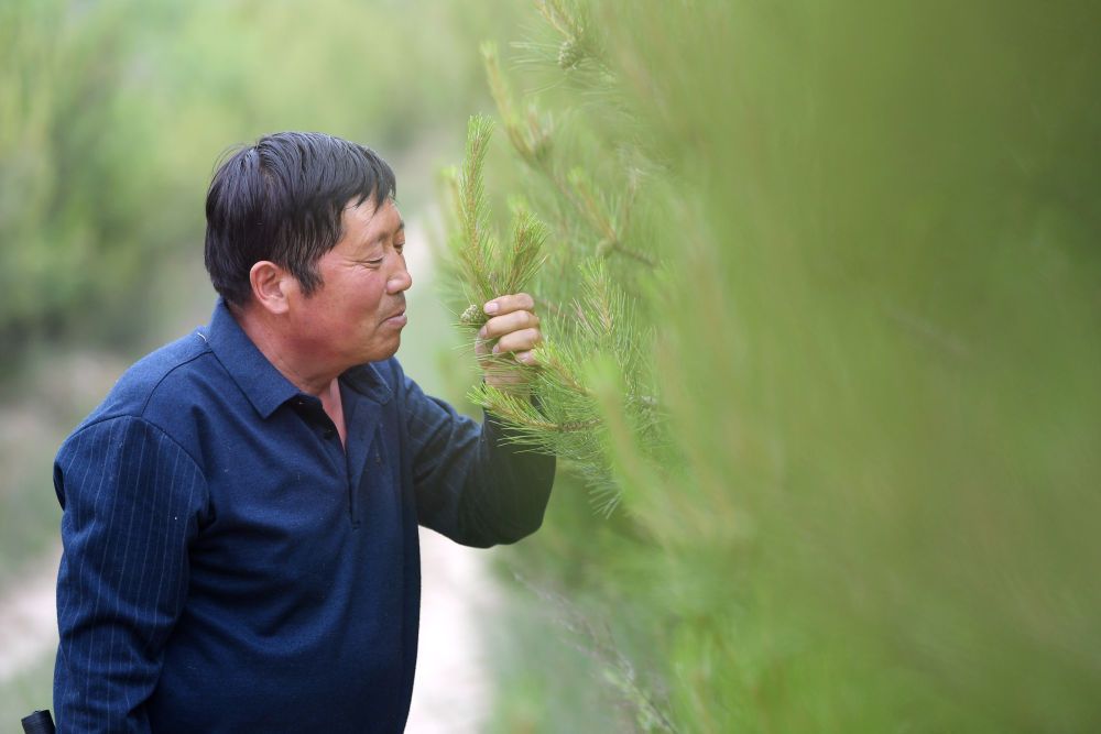 5月25日,在甘肃省庆阳市华池县南梁镇高台村万亩苗林示范点,李文军查看苗木的成长情况。新华社记者 陈斌 摄