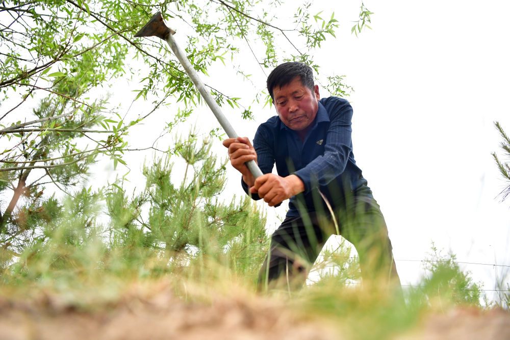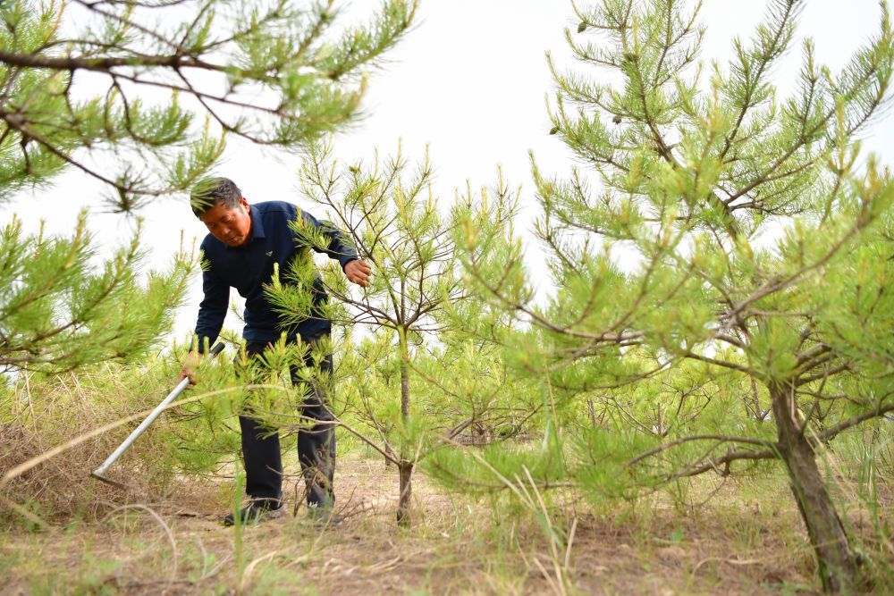 5月25日,在甘肃省庆阳市华池县南梁镇高台村万亩苗林示范点,李文军给苗木松土。新华社记者 杜哲宇 摄