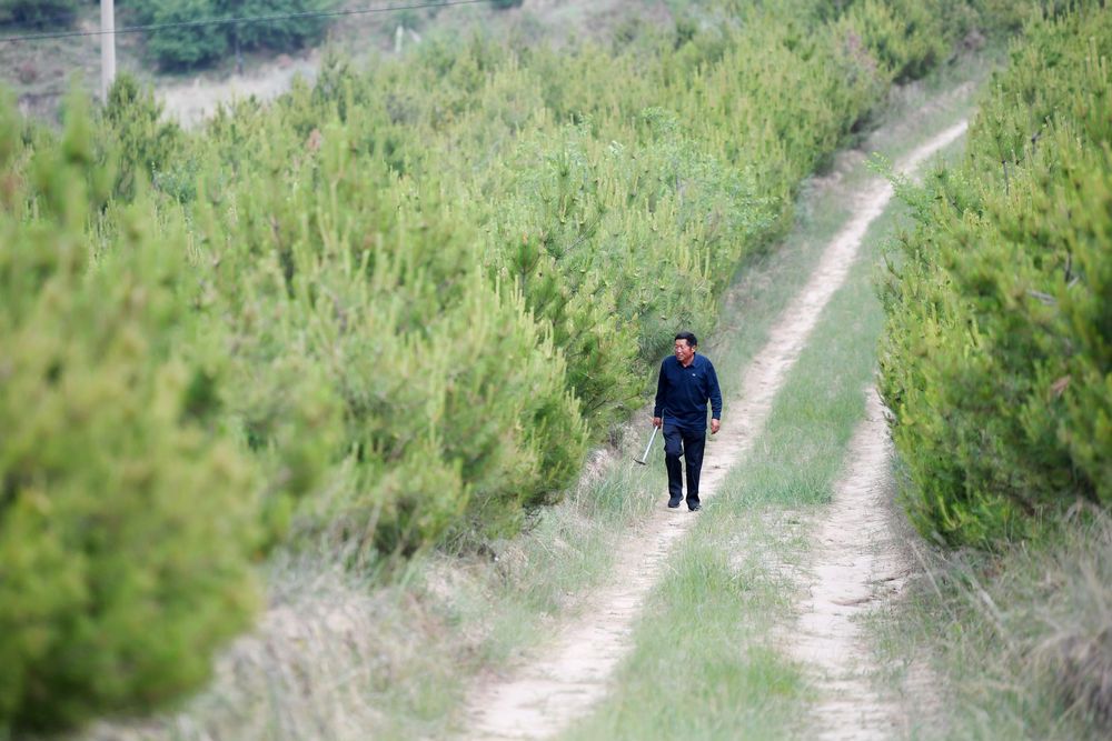 5月25日,在甘肃省庆阳市华池县南梁镇高台村万亩苗林示范点,李文军在巡查途中。新华社记者 陈斌 摄