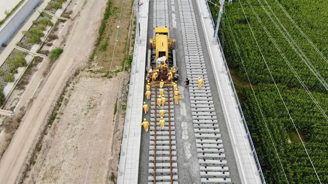 为加快铺轨进度,各施工单位将疫情防控和安全生产“两手抓”,加强沟通配合,不断优化方案和资源配置,通过创新施工工艺,改进机械设备等手段,实行机械化、自动化铺轨,大大提高施工效率。