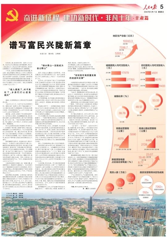 8月7日,人民日报刊发“奋进新征程 建功新时代·非凡十年”甘肃篇,重磅推出两块整版,聚焦党的十八大以来,陇原儿女牢记习近平总书记的殷切嘱托,踔厉奋发、锐意进取,埋头苦干、勇毅前行,加快建设幸福美好新甘肃,不断开创富民兴陇新局面。