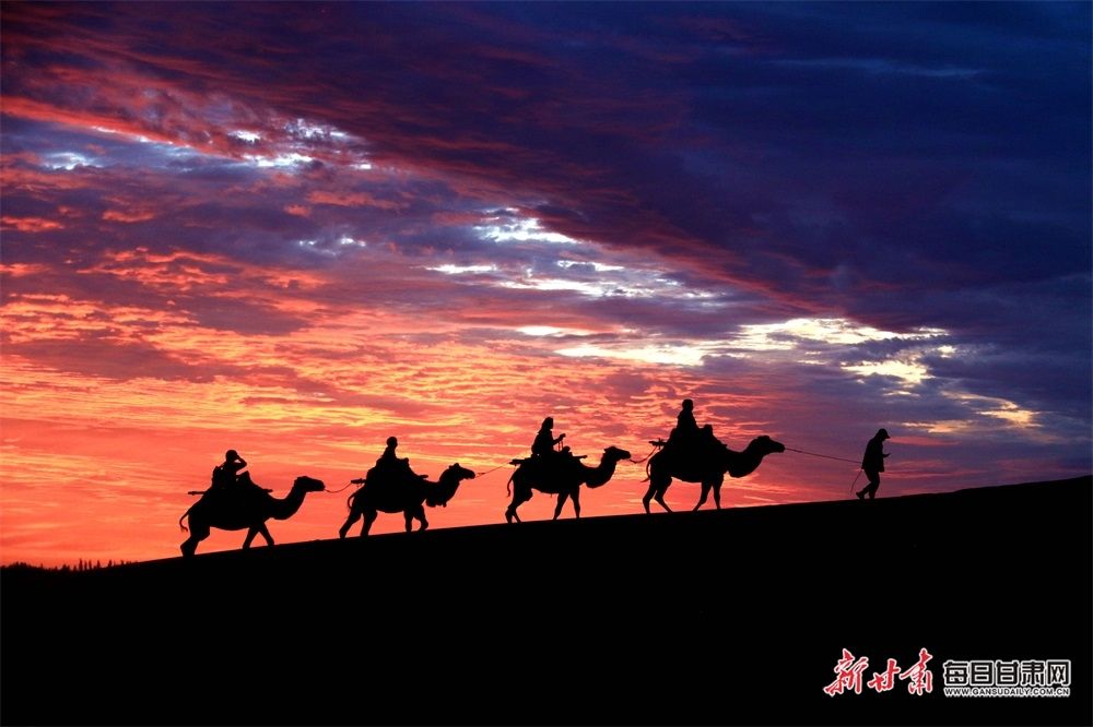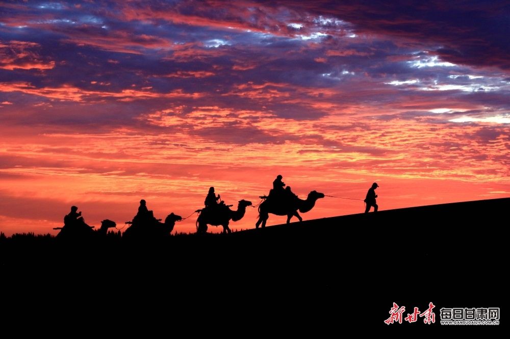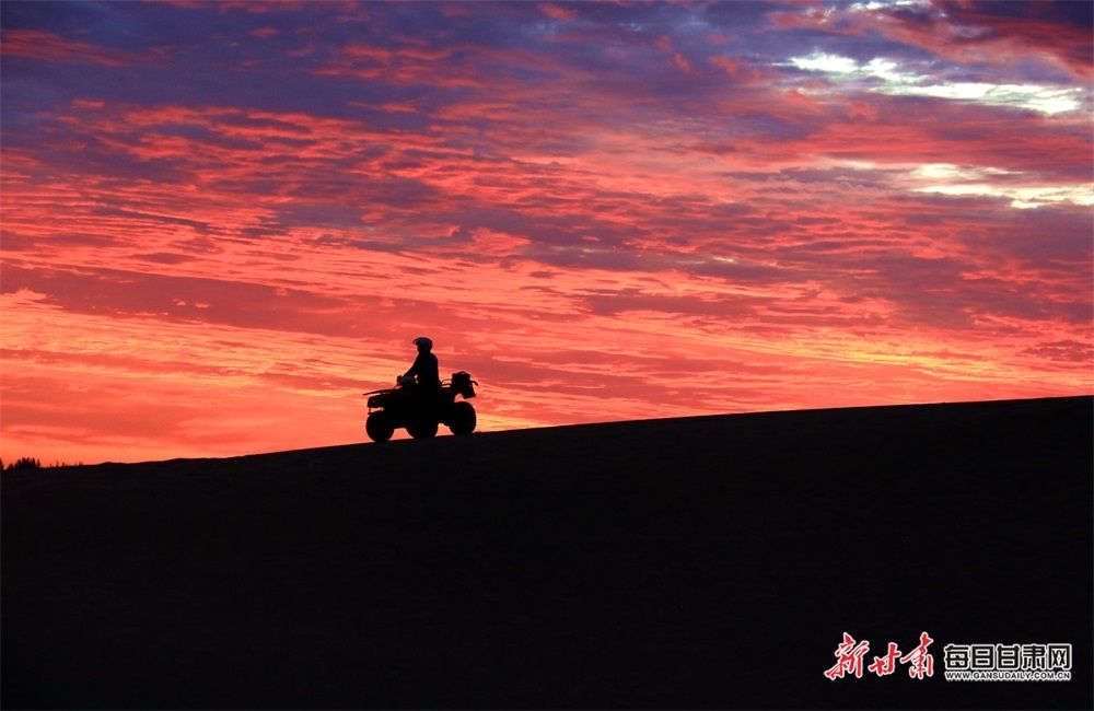 8月7日清晨,雨后的敦煌市鸣沙山月牙泉景区朝霞满天,景色迷人,游客在朝霞的陪伴下欣赏大漠如画风光。