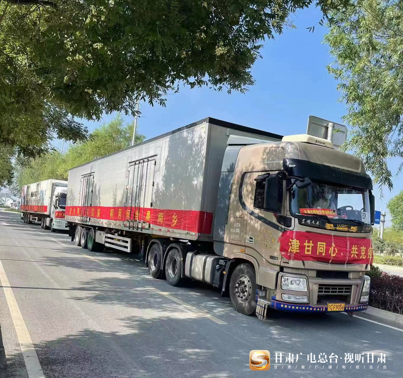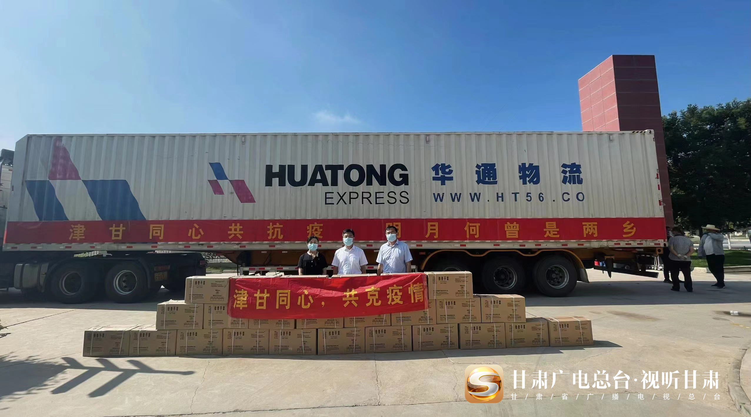 甘肃的疫情时刻牵动着天津人民的心。近日,2辆满载天津市支援甘肃省疫情防控物资的重卡缓缓驶入兰州新区甘肃省红十字救灾备灾中心库房,车上悬挂的“津甘同心,共克疫情”和“津甘同心共抗疫,明月何曾是两乡”条幅凝聚着浓浓的津甘情深。
