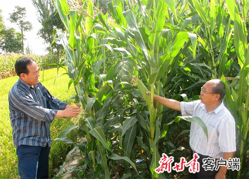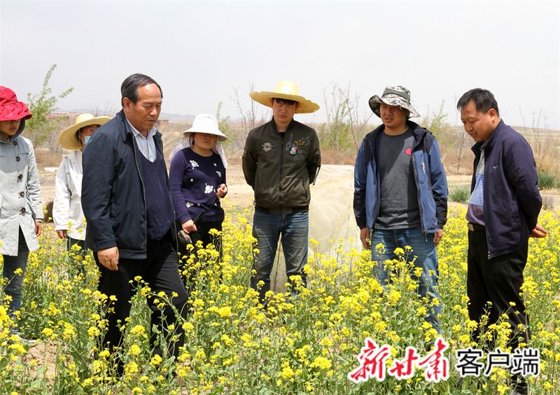 孙万仓(中间)在田地里查看作物长势。(新甘肃·甘肃日报记者 苏家英 摄)