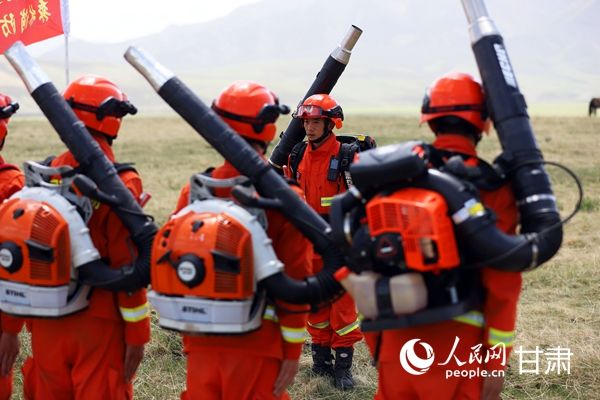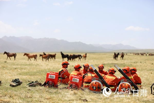 在山丹马场巡护途中,森林消防员们在草原上休整。人民网 王文嘉摄