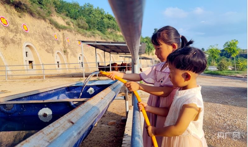 养殖户的孩子正在学习给水槽供水(央广网发 崇信县黄寨镇政府 供图)