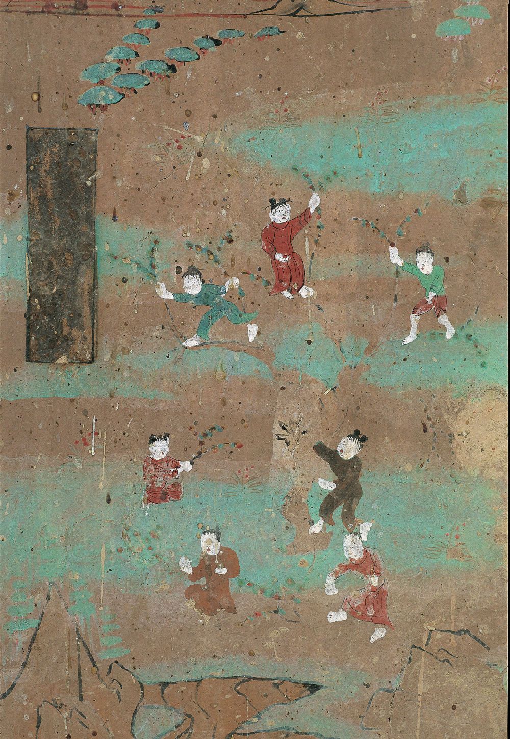 此外,壁画还记录下古代儿童采花、追逐、戏水等充满童趣的画面。藏经洞出土文献中,也有玩弹弓、捉蝴蝶、放纸鹤等游戏内容。