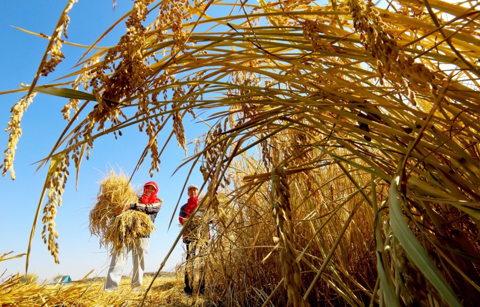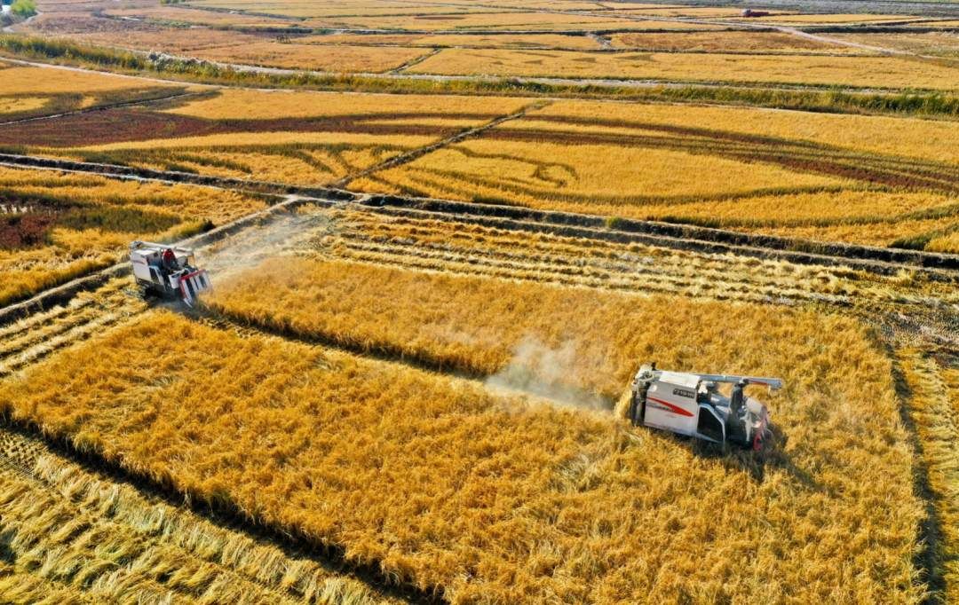金秋十月,张掖市甘州区乌江镇连片稻田已现金黄,种植户们紧抓晴好天气,紧张忙碌地收割成熟的水稻。