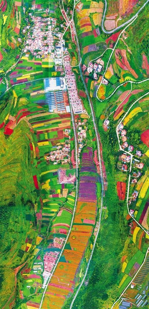 俯瞰渭源县田家河乡元古堆村新貌。元古堆村通过发展农产品加工、乡村旅游、电子商务、光伏发电等产业实现脱贫摘帽,日子越过越红火。王 涛摄(中经视觉)