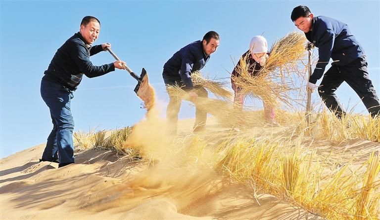 古浪县八步沙林场工人在腾格里沙漠边缘打草方格压沙。甘肃省大力弘扬“时代楷模”八步沙林场“六老汉”的奋斗精神,2012年至2021年,全省累计完成植树造林4321.21万亩,沙化土地综合治理2015万亩。张文灿摄(中经视觉)