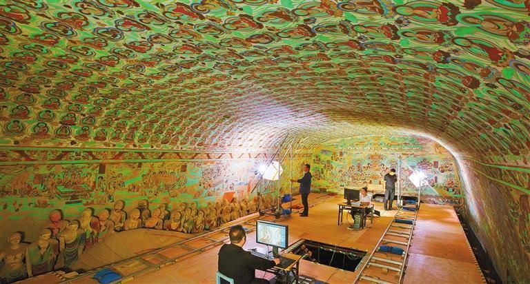 莫高窟第148窟数字化采集工作现场。敦煌研究院在国内率先进行文物数字化的探索研究,形成了一套科学的壁画彩塑数字化技术,制定了14项文物数字化保护技术标准与规范。