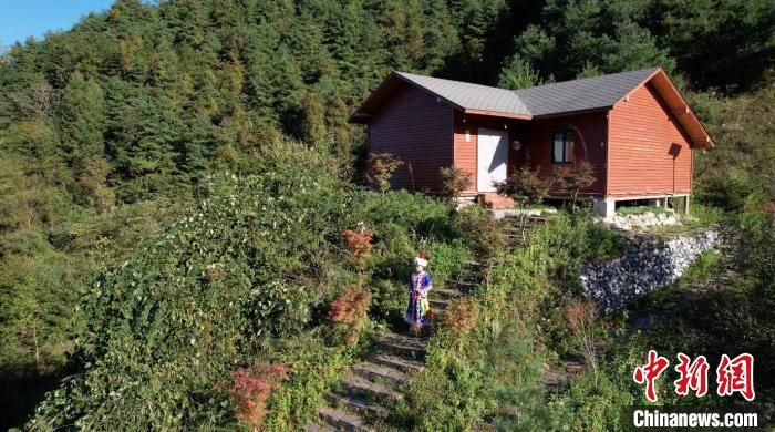 图为裕固族姑娘漫步在康县王坝镇何家庄村的木屋民宿航拍图。高莹摄