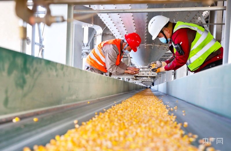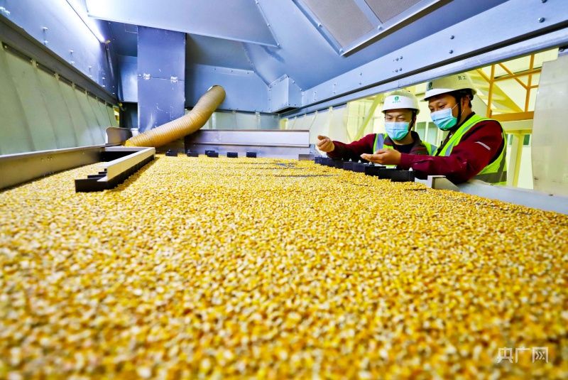 工作人员查看优质玉米良种的精选生产情况(央广网发 刘枫 摄)