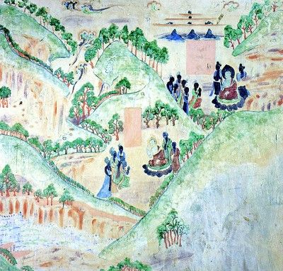 唐前期,由于阎立本、李思训这样身居高位的大画家都到寺院中画壁画,自然对寺院壁画的发展起到很大的促进作用,而李思训等人擅长的青绿山水风格在石窟、寺院壁画中便得以广泛的传播。