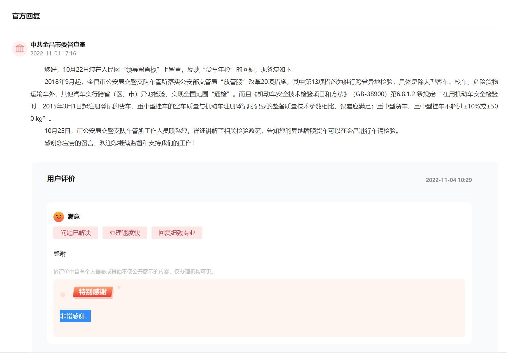 近日,一个“满意”的评价和一句“非常感谢”的“追评”出现在人民网“领导留言板”,这是一位通过留言板解决货车年检难题的网友给予的肯定评价。
