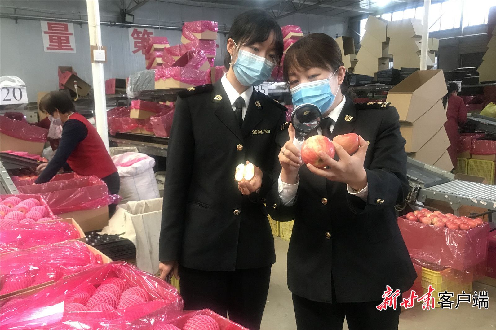 兰州海关所属平凉海关关员查验出口鲜苹果。