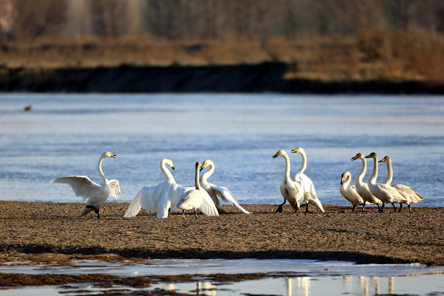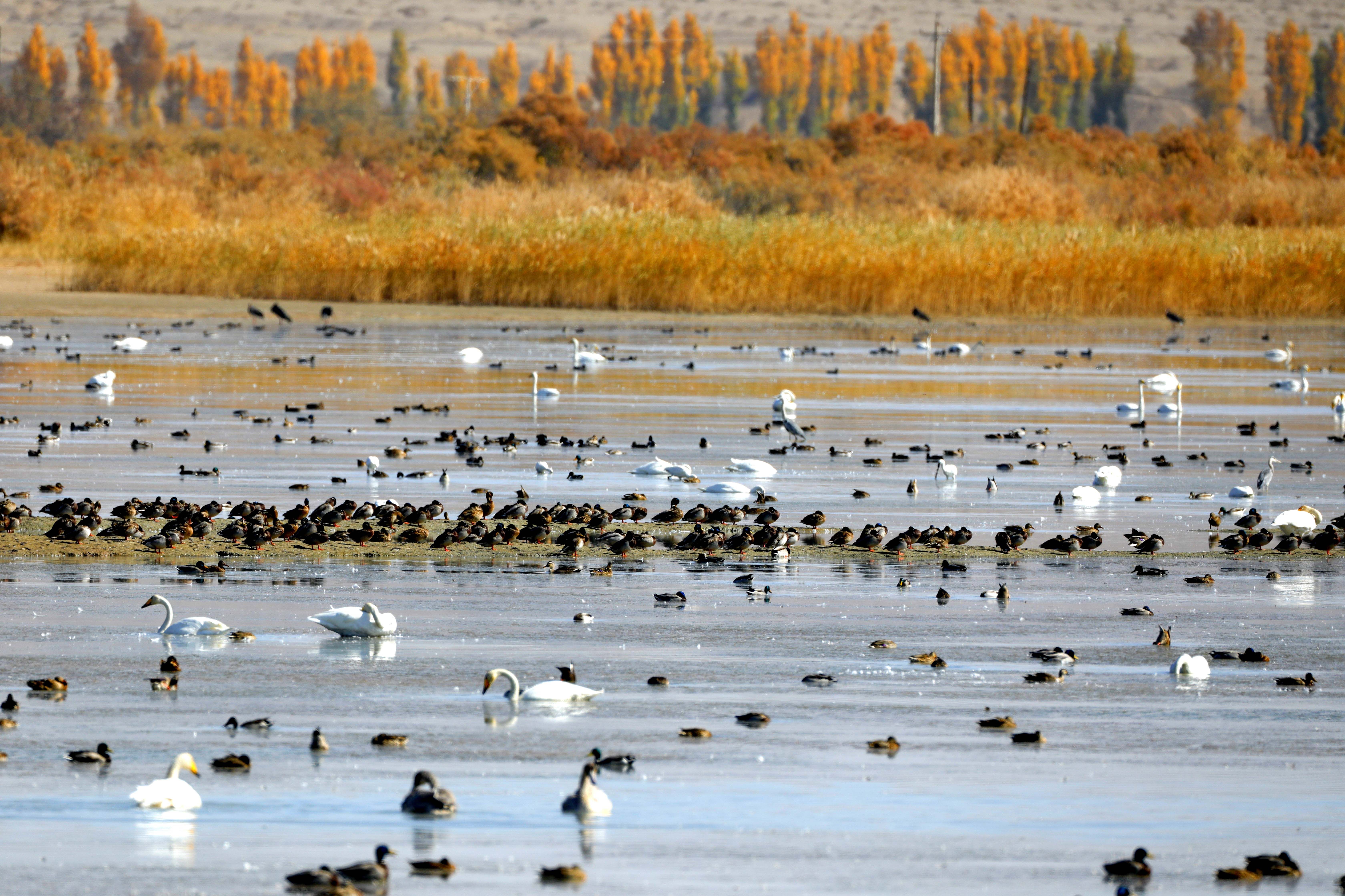 初冬时节,300多只天鹅飞抵甘肃省张掖市高台县黑河湿地嬉戏觅食、栖息越冬,成为当地一道靓丽的风景线。