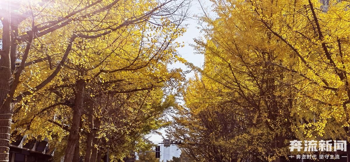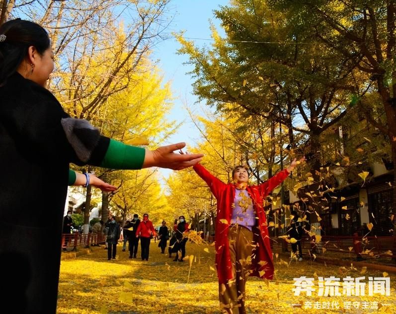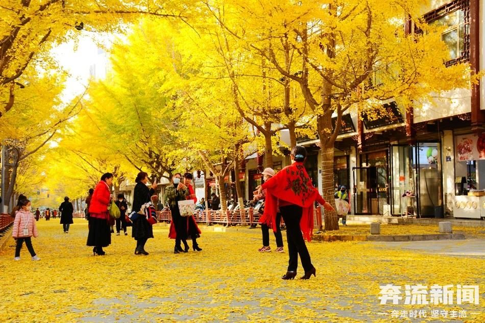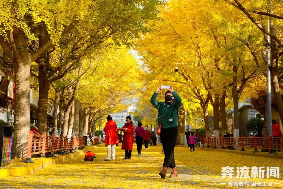 11月15日,奔流新闻记者在天水市秦州区青年北路看到,一株株银杏树挺拔而立,片片黄叶或挂在枝头风过瑟瑟,或铺在脚下金黄一片,引来市民纷纷前来打卡。