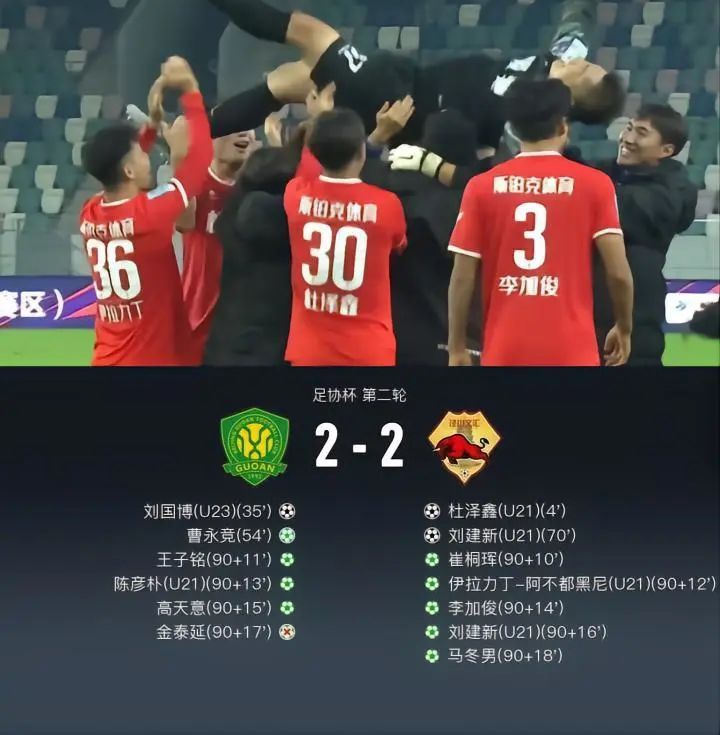 北京时间11月17日15:30,足协杯第二轮,北京国安与泾川文汇的比赛在日照国际足球中心体育场进行。上半场,杜泽鑫任意球闪击,阮奇龙助攻刘国博破门扳平比分。下半场,崔桐珲窝心脚踢中阮奇龙吃到黄点套餐,曹永竞操刀命中助国安反超;随后刘建新推射扳平将比赛拖入点球大战。点球大战中,金泰延罚失,马冬男罚入制胜点球。最终,国安爆冷点球大战3-5,总比分5-7不敌中冠球队泾川文汇遭淘汰。此役过后,来自甘肃的球队泾川文汇顺利晋级16强。