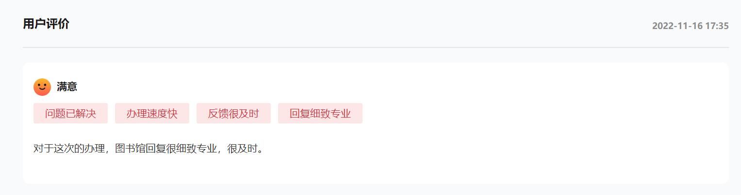 “对于这次的办理,图书馆回复很细致专业,很及时。”遇到的难题在人民网“领导留言板”上得到及时有效的解决,网友最后给予了“满意”评价和追评。
