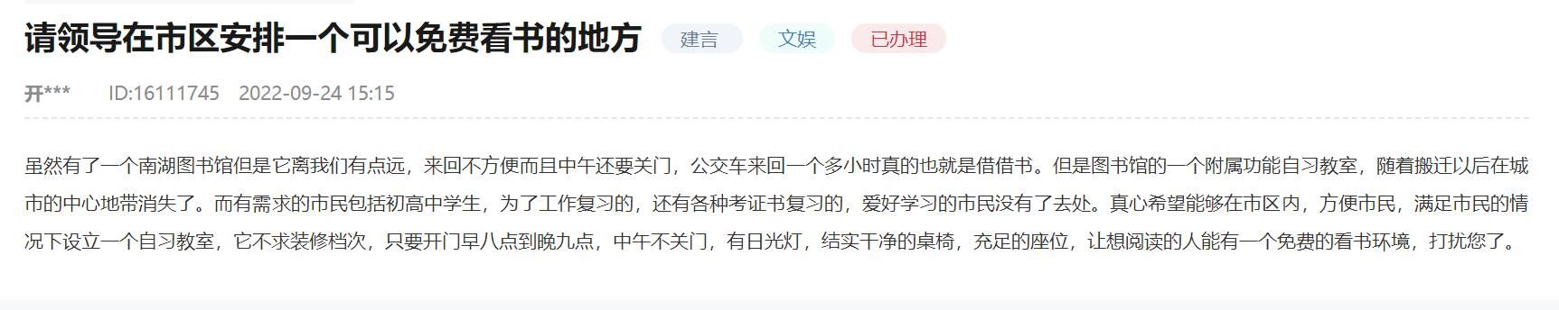 “您反映市区设置自修室的问题文化部门已经统筹设置,能够满足大家阅读学习的需求。服务群众没有止境,我们会不断地提升服务能力和水平,为大家提供更加优质、更加个性化的服务。”针对网友的留言,嘉峪关市政府也作出了进一步的回复,并安排嘉峪关市文旅局以群众需求为导向,建立公共文化服务群众需求征集和评价反馈机制,拓宽公众信息渠道,畅通需求表达途径,推动文化惠民项目与群众文化需求有效对接,大力开展“菜单式”“订单式”服务,不断增强群众对公共文化服务的知晓度、参与度和满意度。