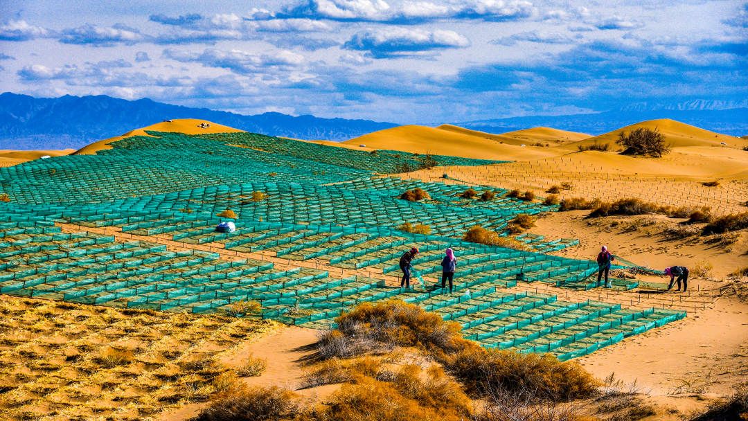 基于北部沙区造林立地条件差、交通不便利、水资源严重短缺问题,当地加强与知名院校的合作,科学运用温湿度、风速、风蚀程度等监测数据指导造林绿化。积极改进草方格沙障基本材料,并发明专门用于稻草方格沙障的钝刃直板铁锹,提高施工效率。广泛推广保水剂应用技术,提升土壤保水率,有效缓解干旱缺水问题。建立“1年建设期+2年管护期”绩效目标责任,北部防风固沙锁边林地、沙化草原生产力生态效益日益凸显,林草碳汇储备总量增加,为全市经济社会发展提供了生态支撑。
