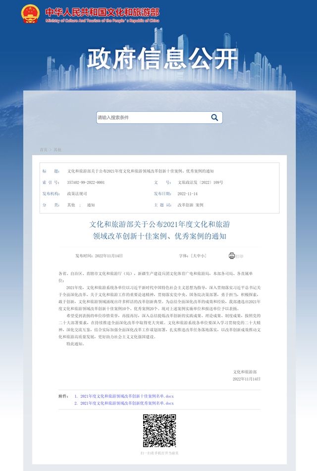 文化和旅游部通报表扬2021年度文化和旅游领域改革创新十佳案例、优秀案例。