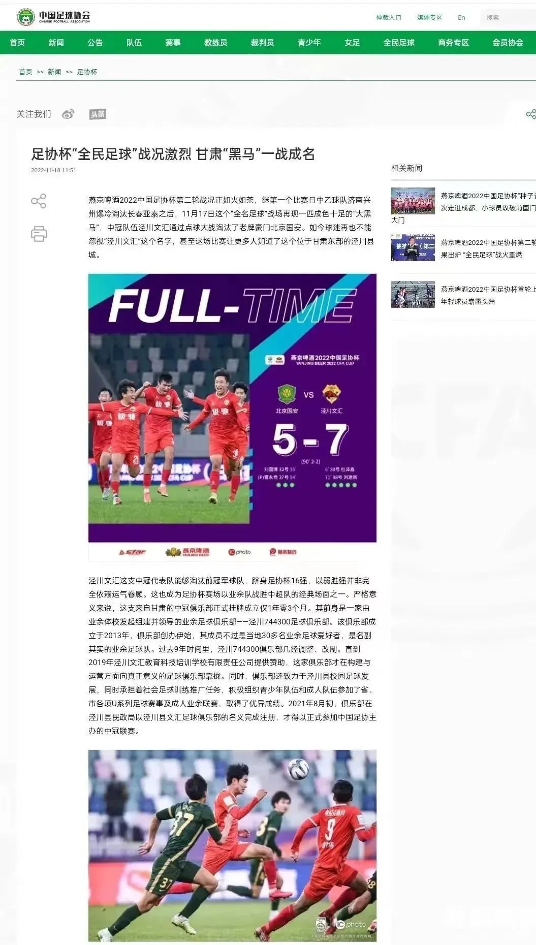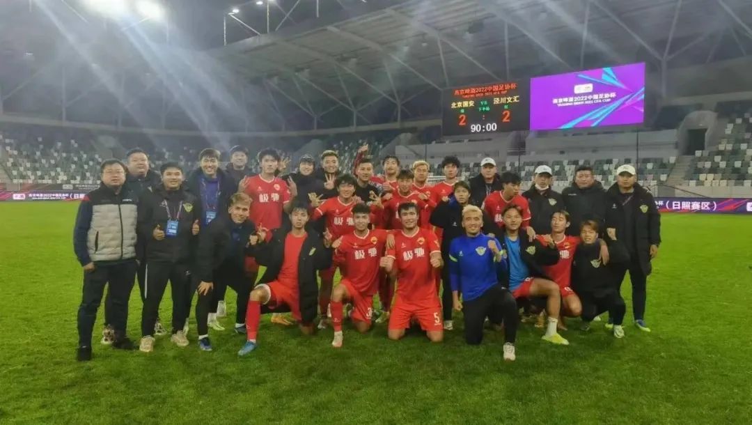 在2022年足协杯第二轮比赛中,一支来自甘肃的县级球队——泾川文汇足球队在常规时间内2:2战平中超豪门球队北京国安,随后点球大战以总比分7:5淘汰对手,进入足协杯第三轮。