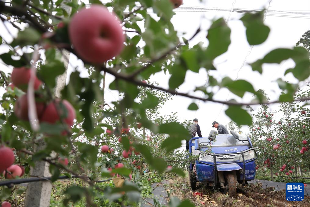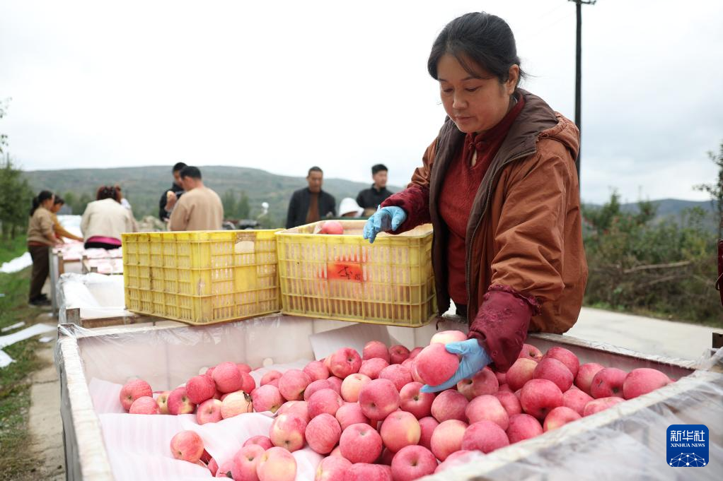 果商在甘肃省陇南市礼县永兴镇何家村一处苹果种植基地外收购苹果(10月14日摄)。新华社记者 陈斌 摄