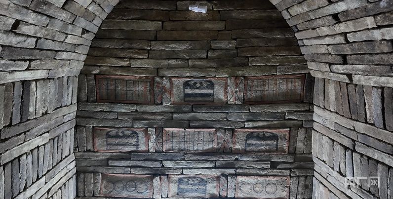 骆驼城苦水1号墓复原墓葬一景羽人神兽图壁画砖(央广网记者 魏晋雪 摄)
