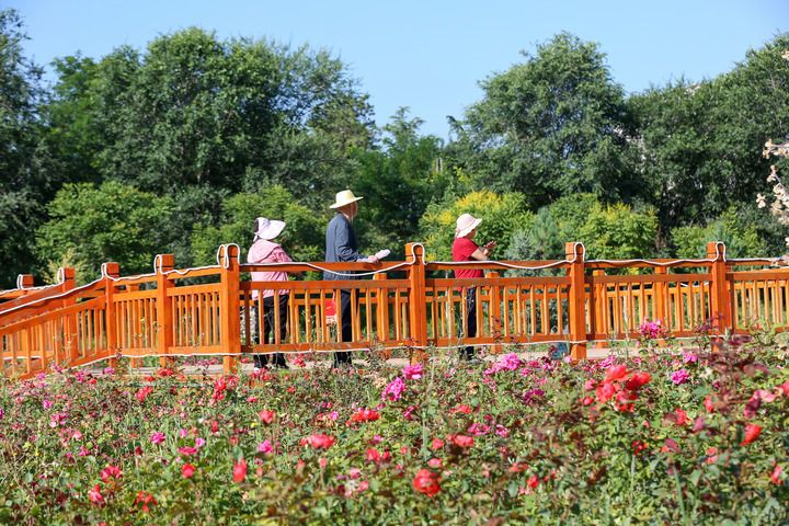 2025年7月7日,市民在平凉市崆峒区中心城区的平凉城市活力公园赏花、锻炼。 新华社发(吴希会摄)
