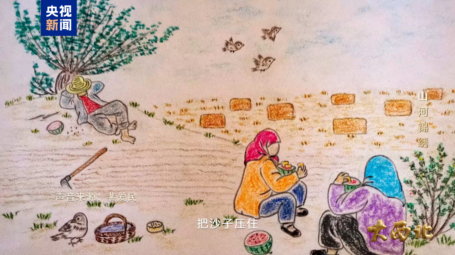 这首关于沙漠和种树的诗歌,就出自“田鼠大婶”。“田鼠大婶”,本名裴爱民,是甘肃民勤县薛百镇上新村村民,也是一名庄稼人、种树人。闲暇时刻,她用诗歌书写她生活的土地;用蜡笔画出自己在家乡植树,种植草方格的情景。