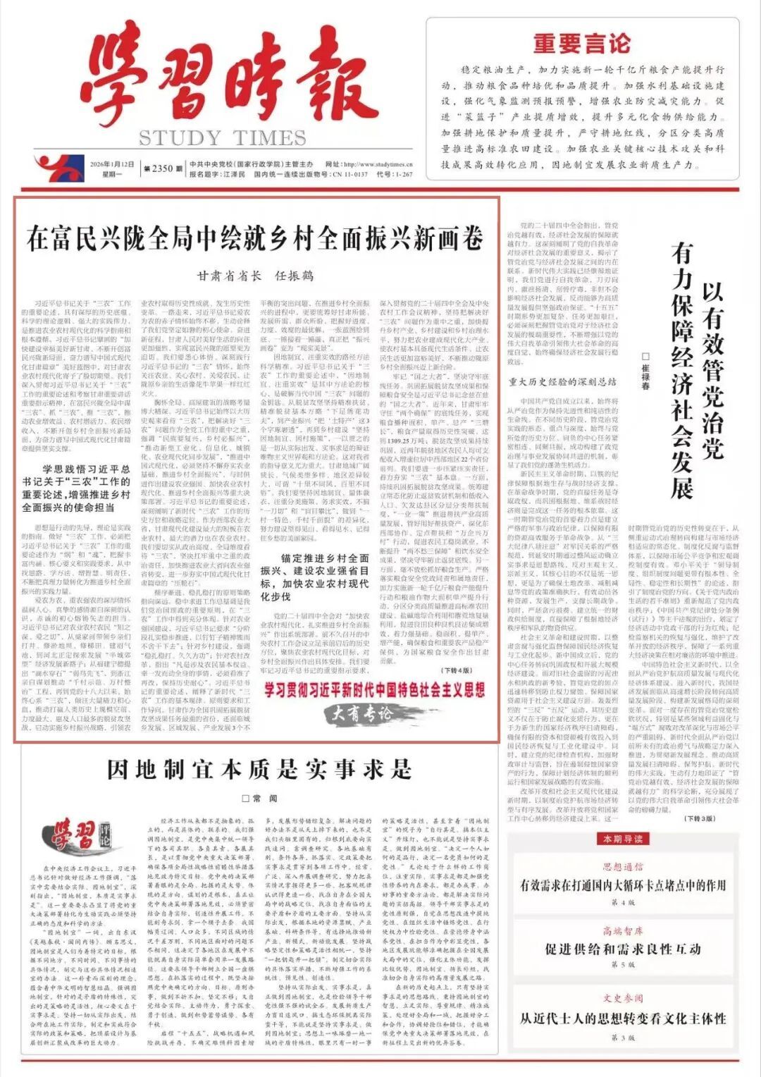 循序渐进、稳扎稳打的原则策略指向深远。稳中求进工作总基调是我们党治国理政的重要原则,在“三农”工作中得到充分体现。针对农业强国建设,习近平总书记要求“分阶段扎实稳步推进,以钉钉子精神锲而不舍干下去”;针对乡村建设,强调“稳扎稳打、久久为功”;针对农村改革,指出“凡是涉及农民基本权益、牵一发而动全身的事情,必须看准了再改,保持历史耐心”。习近平总书记的重要论述,阐释了新时代“三农”工作的基本规律、原则要求和工作导向。甘肃作为全国巩固拓展脱贫攻坚成果任务最重的省份,还面临城乡发展、区域发展、产业发展3个不平衡的突出问题,在推进乡村全面振兴的进程中,更要统筹好甘肃所能、发展所需、群众所盼,把握好进度、力度、效度的最优解,一张蓝图绘到底、一锤接着一锤敲,真正把“振兴画卷”变为“现实美景”。