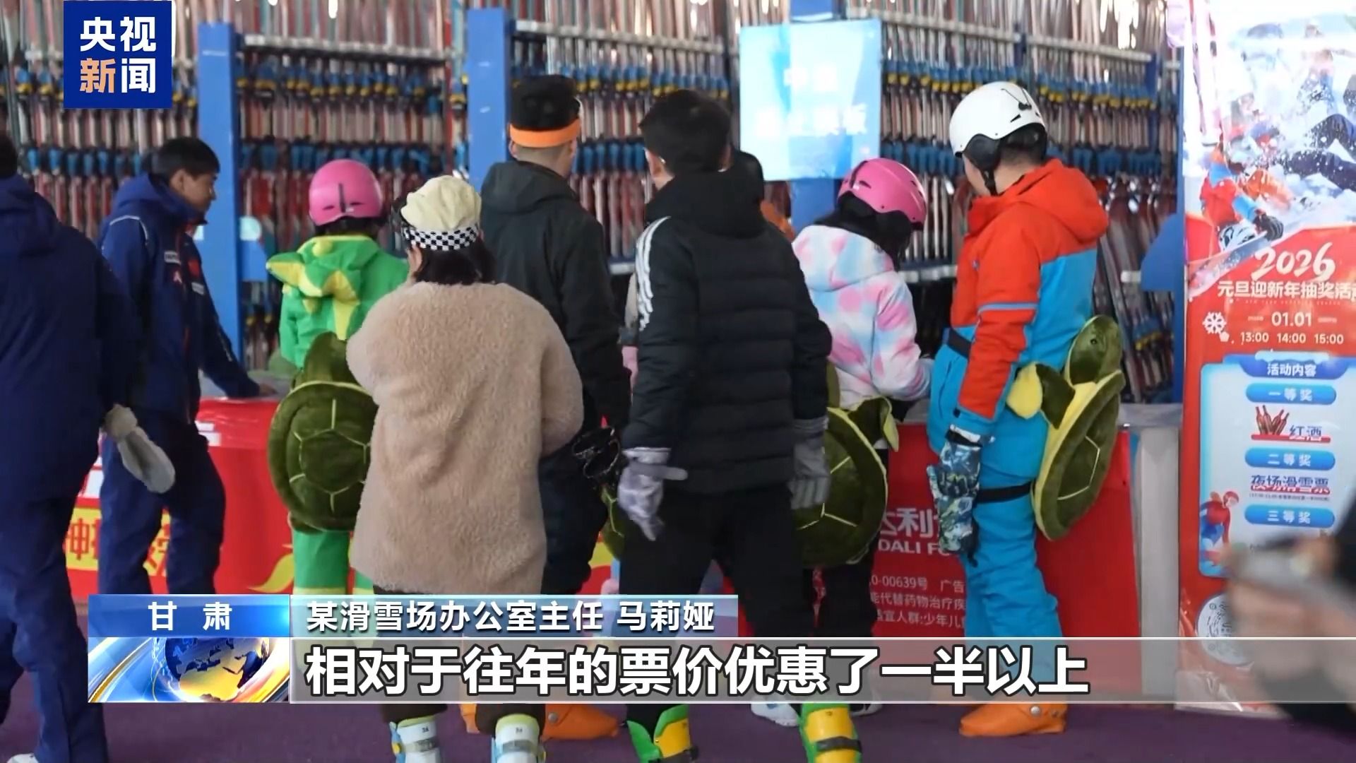 某滑雪场办公室主任 马莉娅:线上线下都有优惠,针对大学生、宝妈、亲子家庭,人均100元就能在滑雪场畅玩一整天,相对于往年的票价优惠了一半以上。