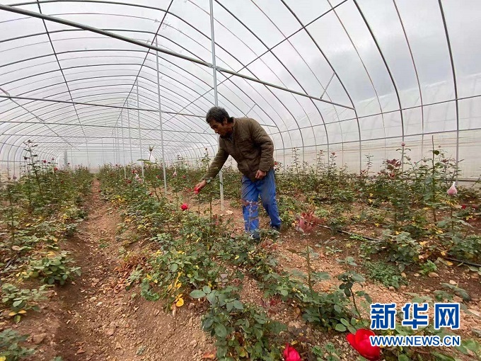 方万录在打理玫瑰花田。新华网发(王朋 摄)
