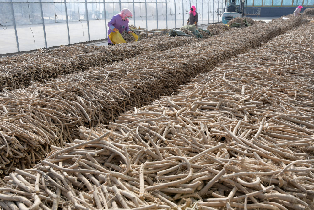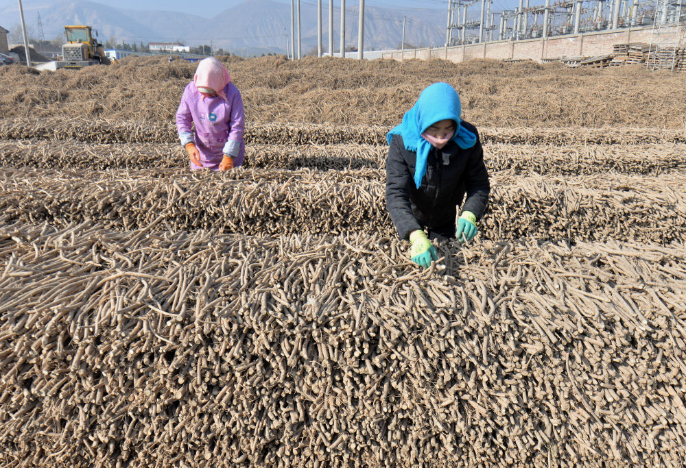 11月28日,在甘肃省永靖县有机黄芪收储加工基地,工人整理黄芪。新华社发(史有东 摄)