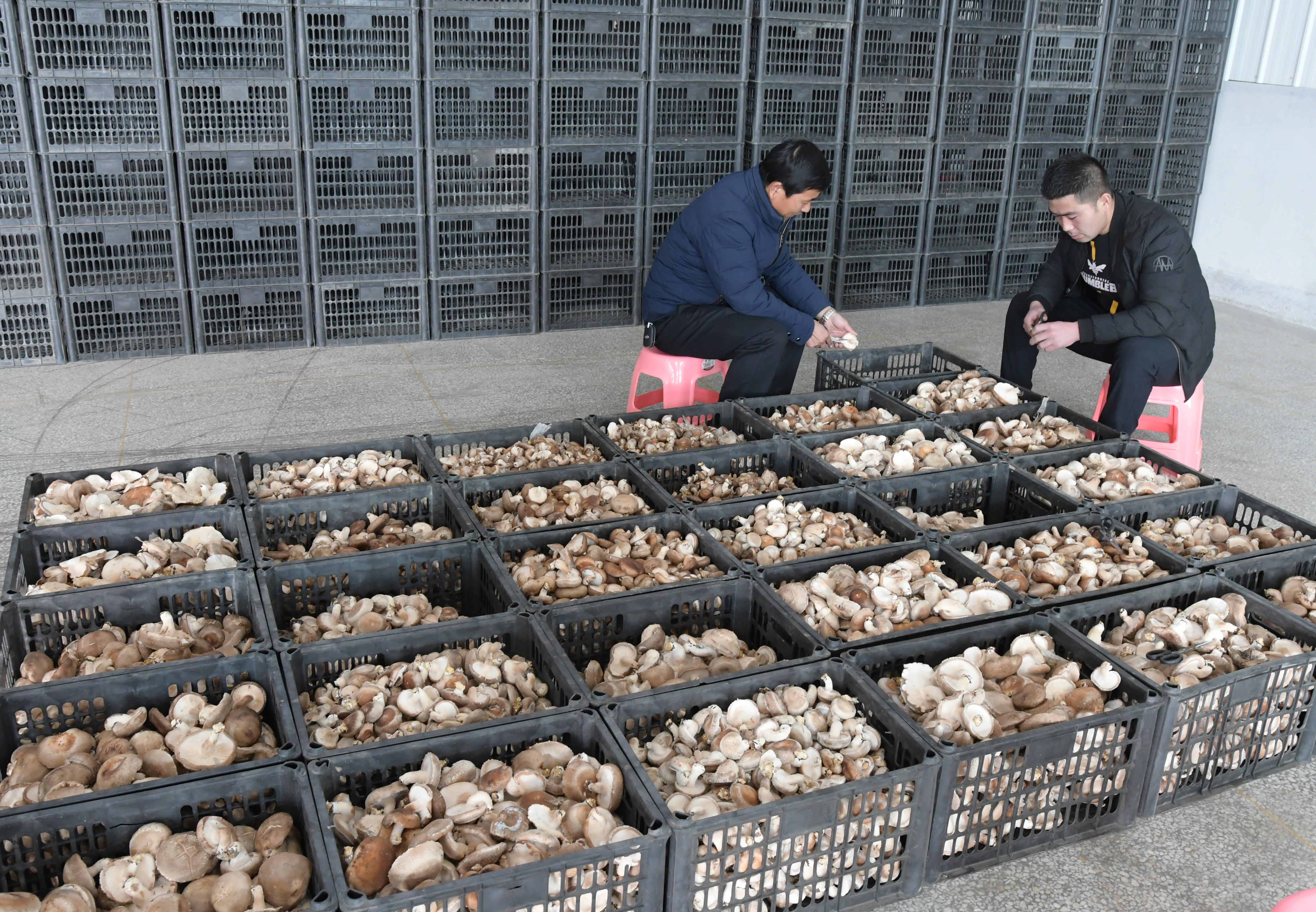 ↑12月12日,工人在东乡族自治县那勒寺易地扶贫搬迁安置点后续产业园里分拣香菇。