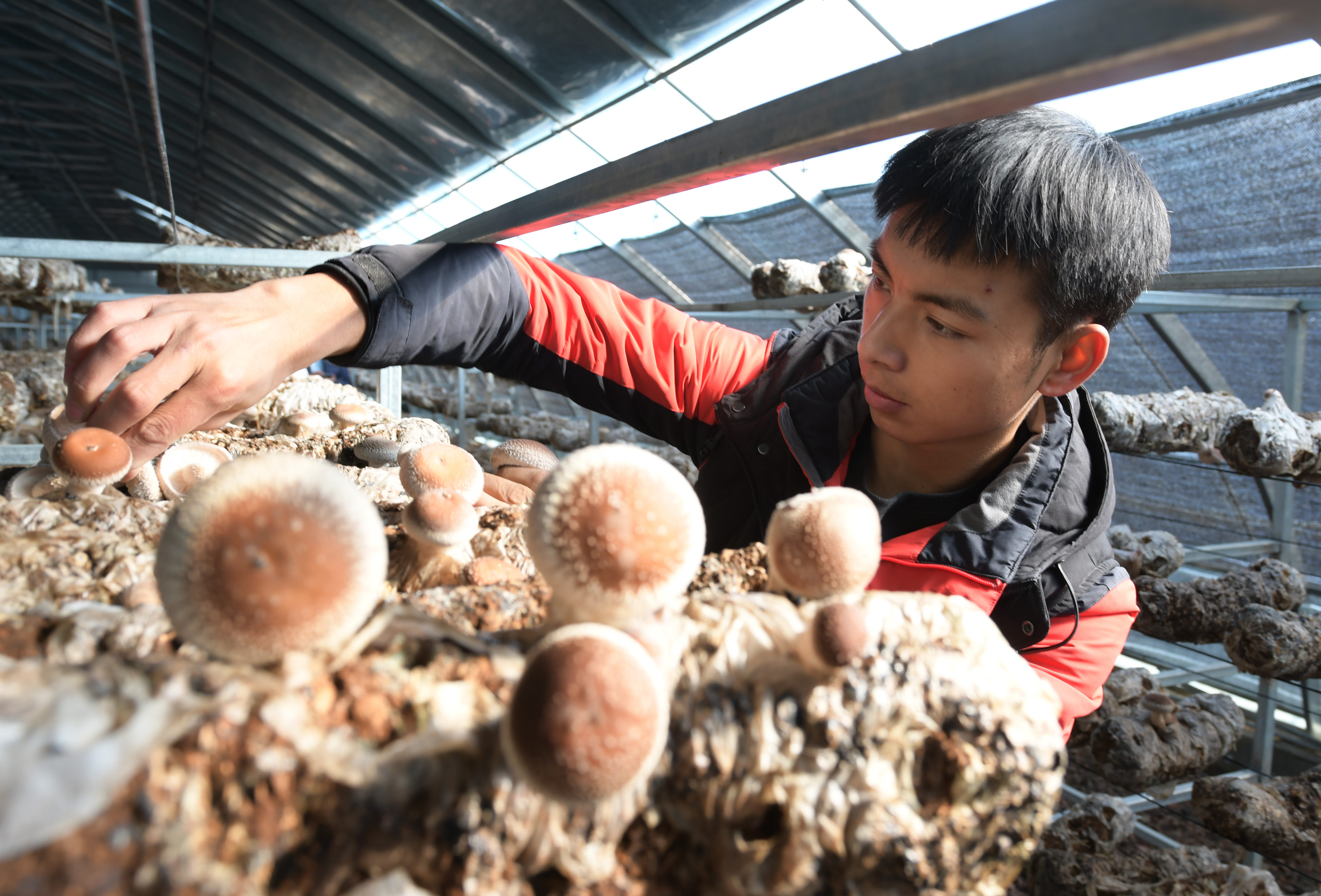 ↑12月12日,工人在东乡族自治县那勒寺易地扶贫搬迁安置点后续产业园温棚里采摘香菇。