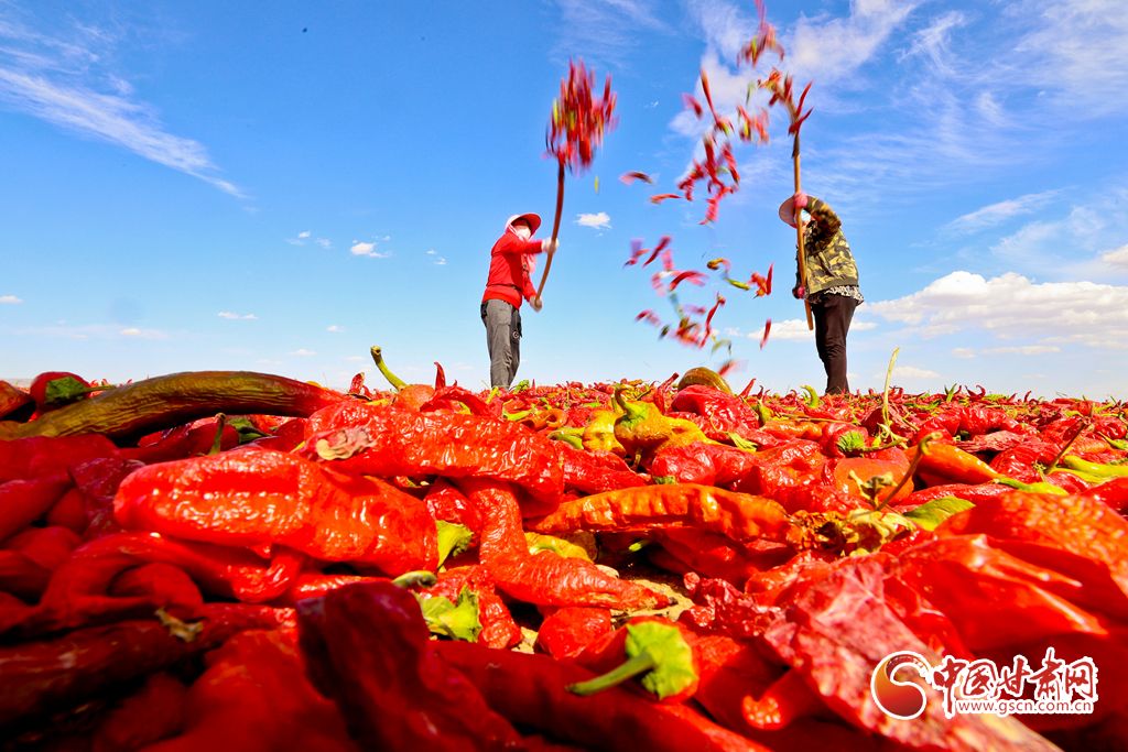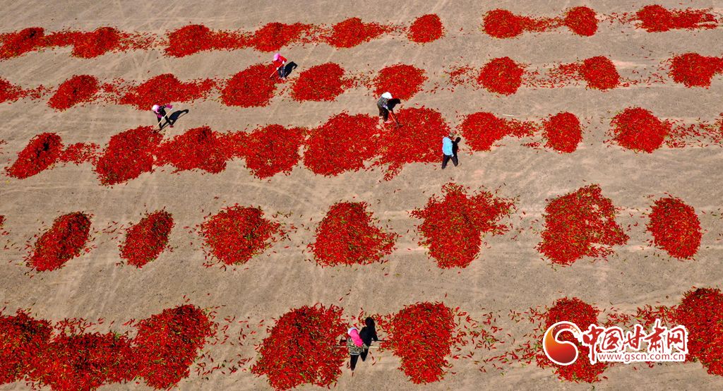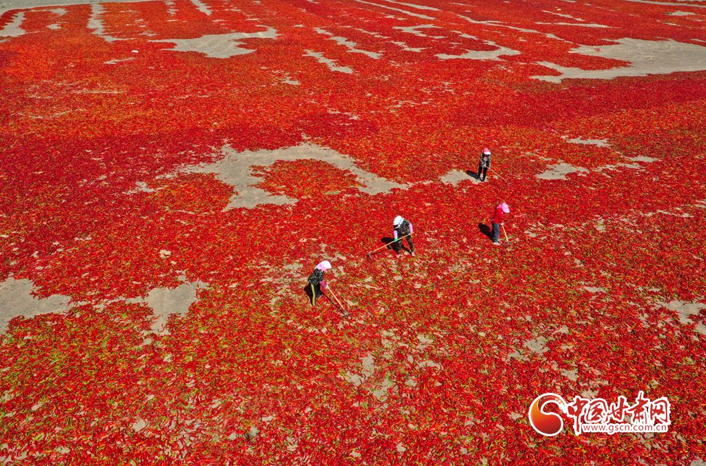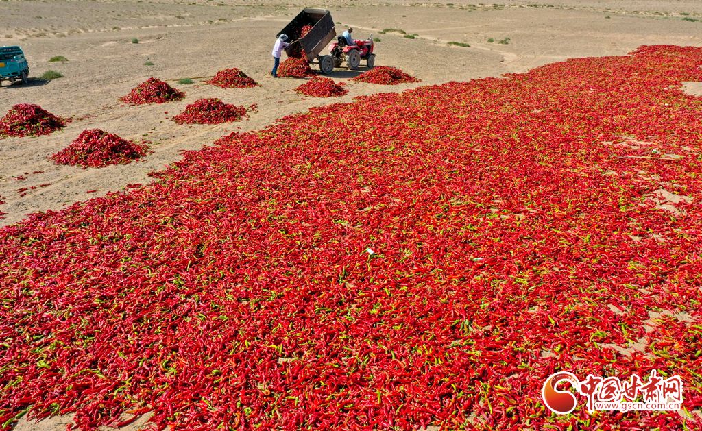 9月7日,张掖市高台县黑泉镇十坝珍珠滩上,辣椒种植农户们紧抓天气晴好时机晾晒“订单红辣椒”。连日来,高台县黑泉镇种植的5000多亩辣椒进入全面采摘晾晒期,田间地头到处是种植户们忙碌的景象。