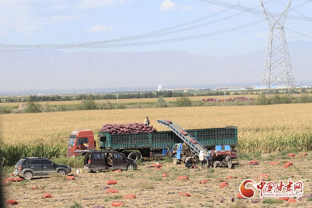 脚下有稻田,耳边有水声。带着泥土的洋葱整跺码放,依次装进卡车里,鲜绿的高原夏菜在田间地头收割后送进发往南方的冷柜,百亩靑储玉米经过压缩打包等待进入牧场粮仓……祁连山下秋收正在火热进行中。