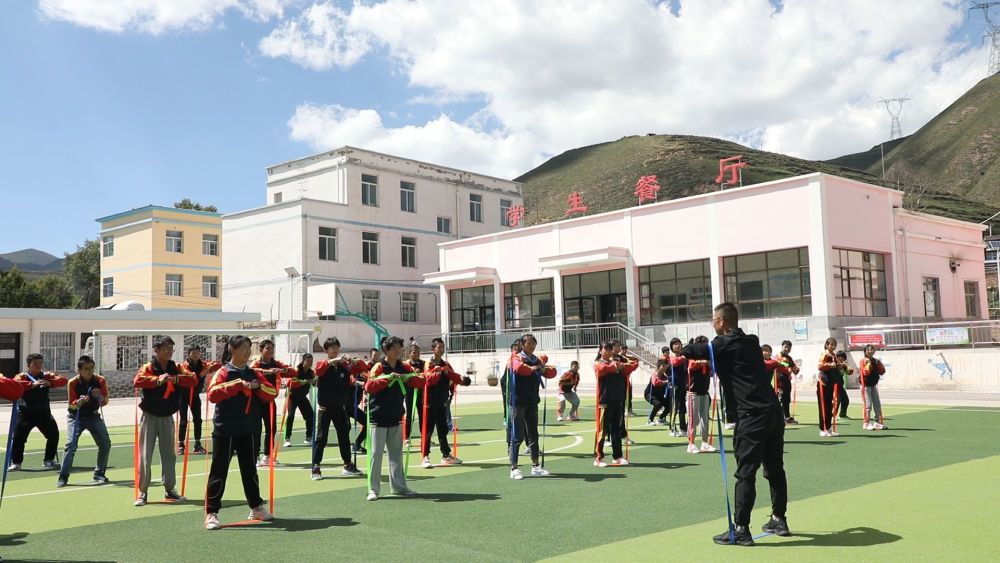 甘肃省兰州市榆中县马坡学校教师豆磊正在给学生们上体育课。新华社记者 郎兵兵 摄