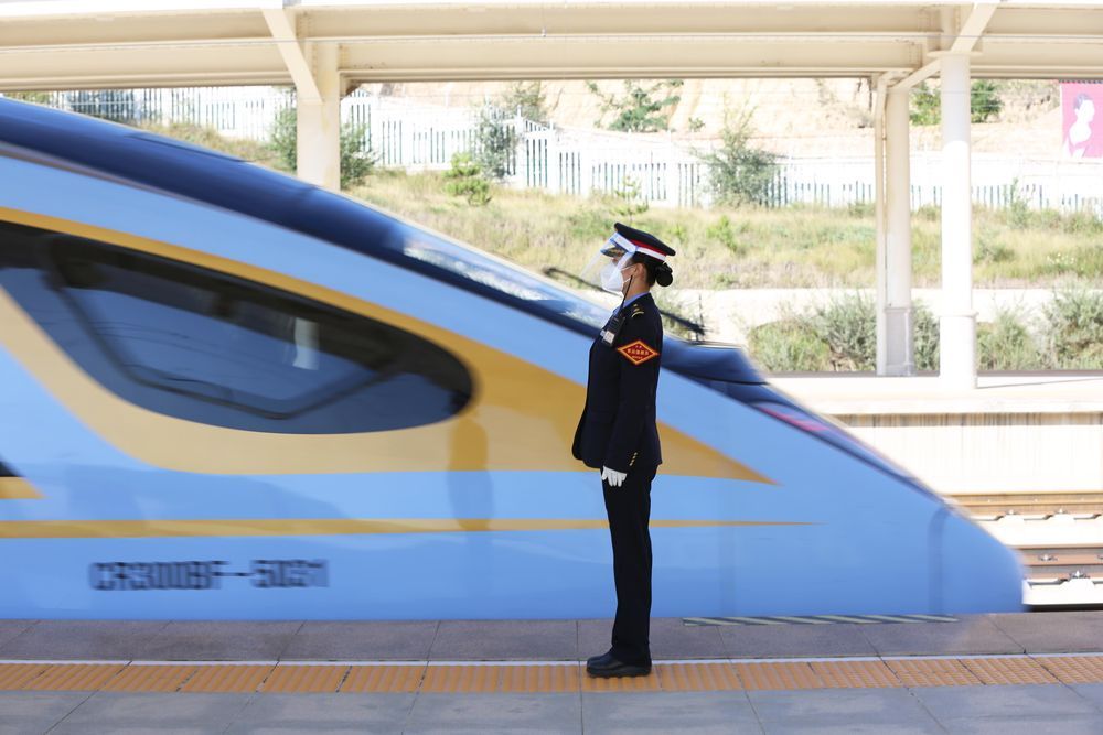 9月10日,宝兰高铁甘肃定西北站的工作人员在站台上送车。