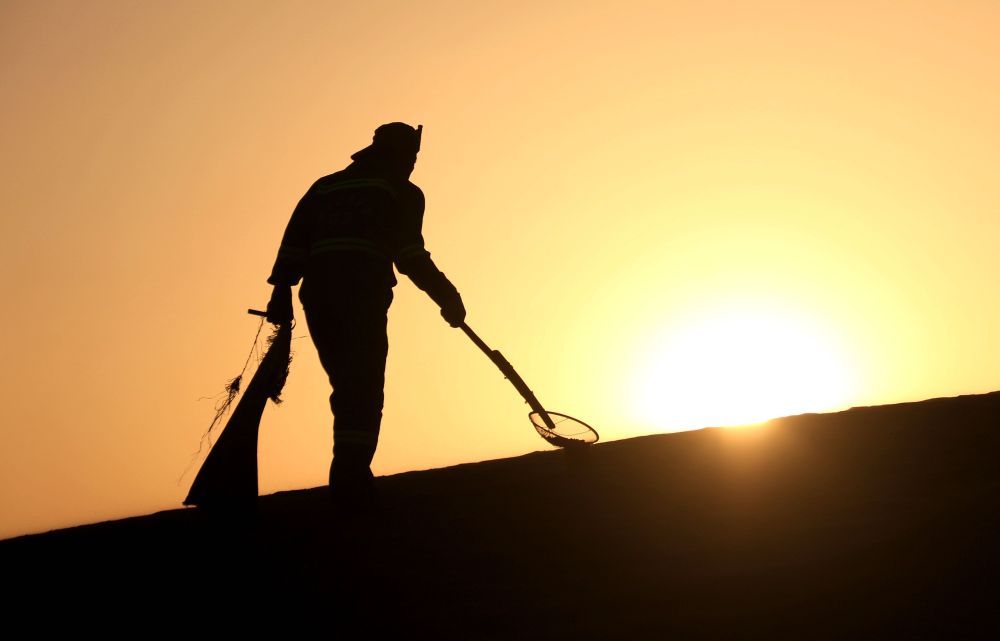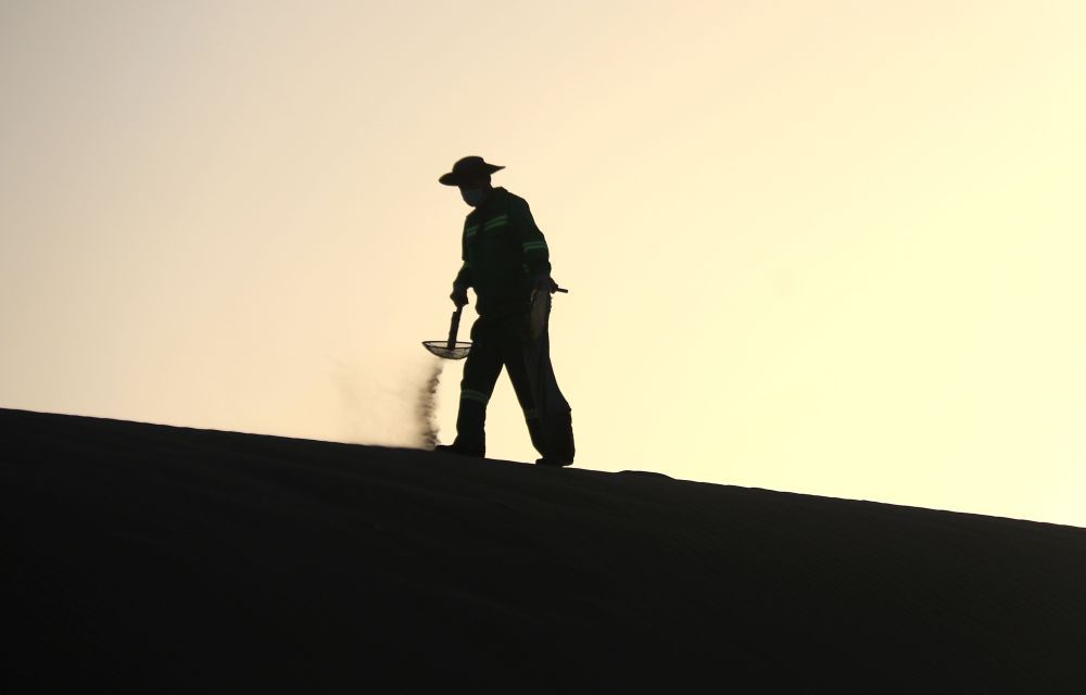 9月10日,保洁人员在甘肃敦煌市鸣沙山月牙泉景区保洁。新华社发(张晓亮 摄)