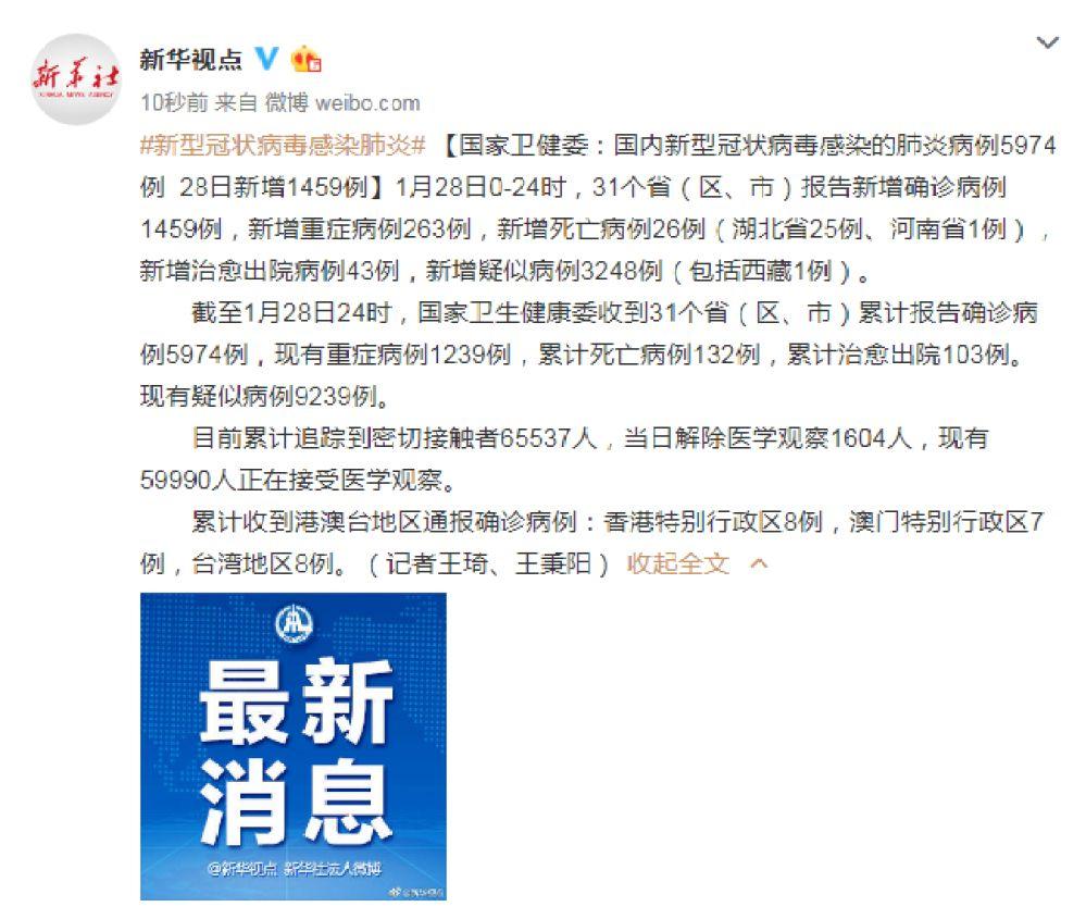 全国确诊新型冠状病毒肺炎5974例 死亡132例 治愈103例